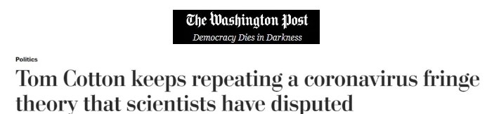 這位來自阿肯色州的參議員曾多次表示,雖然他沒有證據(jù)證明病毒起源于實驗室,但是必須要尋找相關(guān)證據(jù),這些表態(tài)其實已經(jīng)帶有非常強烈的有罪推定的色彩。其他一味鼓吹叫囂實驗室泄漏的人也從未拿出實質(zhì)性的證據(jù)。《華盛頓郵報》指出,以湯姆·科頓為代表的觀點就是一場陰謀論。