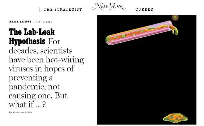 其后“實驗室泄漏說”在美國掀起的一點小風(fēng)浪,源自今年1月小說家尼克爾森·貝克在《紐約雜志》上發(fā)表的一篇封面文章,文章中提到了一個精心設(shè)計的實驗室。