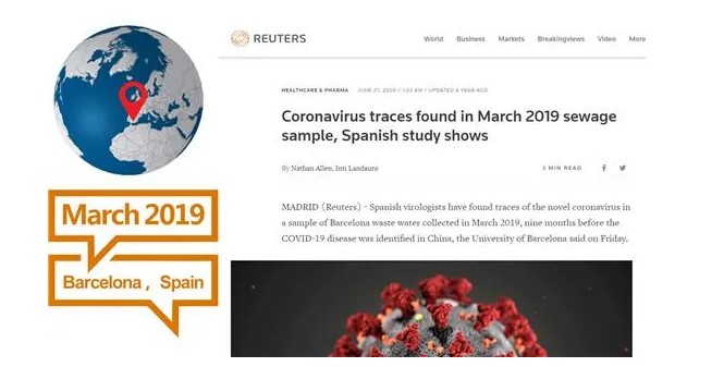 路透社2020年6月報道說,西班牙巴塞羅那大學(xué)領(lǐng)導(dǎo)的一個研究小組在2019年3月采集的巴塞羅那廢水樣本中檢測出新冠病毒。