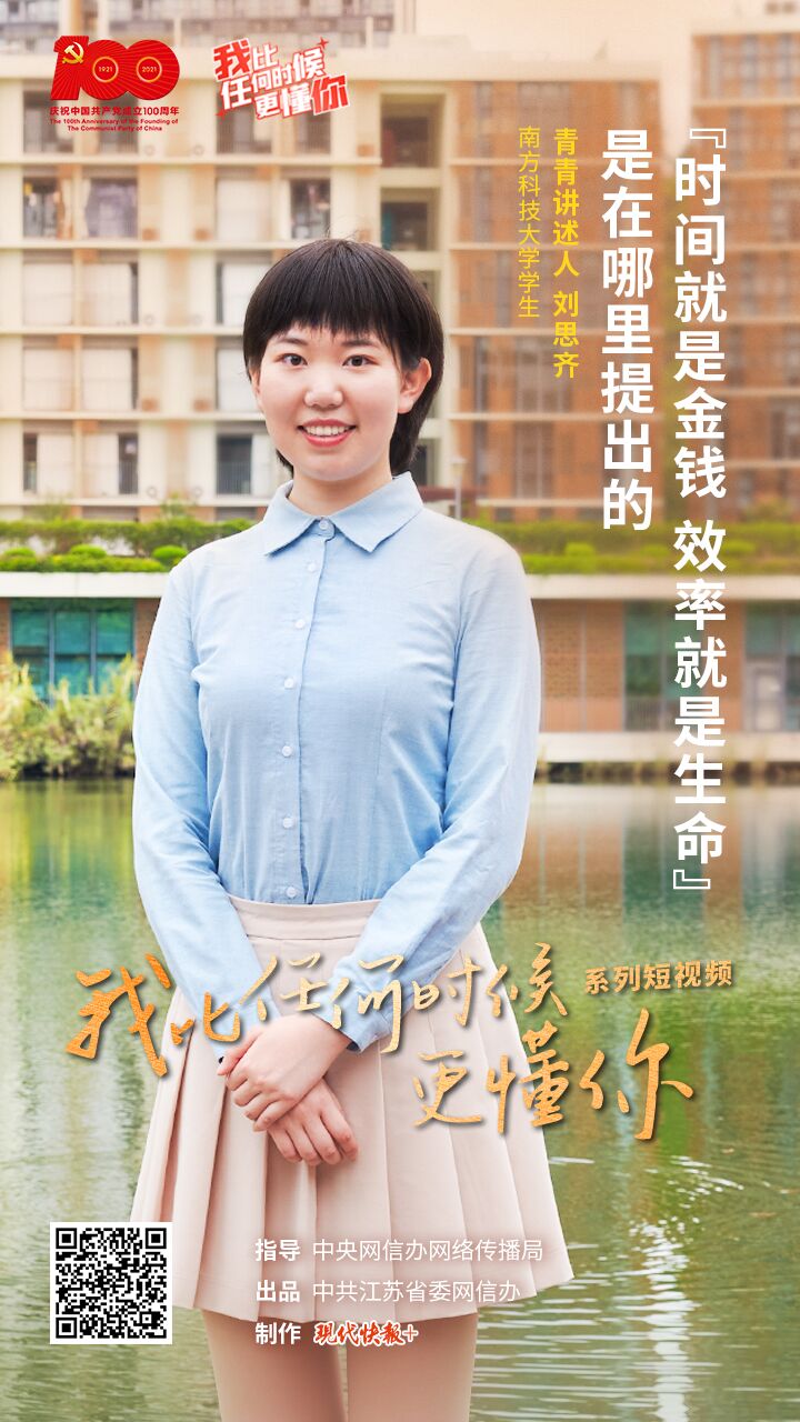 7月28日,“我比任何時候更懂你”系列短視頻第4集《“時間就是金錢,效率就是生命”是在哪里提出的?》上線,本集青青講述人是南方科技大學(xué)學(xué)生劉思齊。