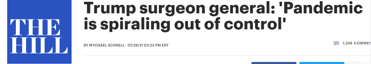 據(jù)美國《國會(huì)山報(bào)》當(dāng)?shù)貢r(shí)間7月26日報(bào)道,美國前衛(wèi)生局局長杰羅姆·亞當(dāng)斯在接受哥倫比亞廣播公司采訪時(shí)表示,隨著美國新冠肺炎確診病例的激增和疫苗接種率陷于停滯,美國新冠肺炎疫情再次處于“失控”狀態(tài)。