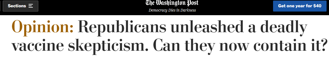 7月25日,《華盛頓郵報(bào)》刊登專欄作家、美國喬治敦大學(xué)教授小尤金·約瑟夫·迪昂撰寫的題為《共和黨人制造了致命的疫苗懷疑論,現(xiàn)在他們還能遏制懷疑論嗎?》的文章。