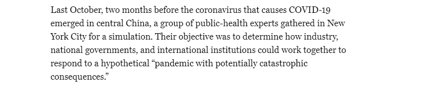 除了出現(xiàn)的早期病例,最近人們的目光還聚焦在了2019年美國舉行的一場流行病演習(xí)上。美國《紐約雜志》報(bào)道稱,那一年的10月,美國舉行了一場代號(hào)為“事件201”的全球流行病大演習(xí),模擬一種冠狀病毒在全球范圍內(nèi)傳播。