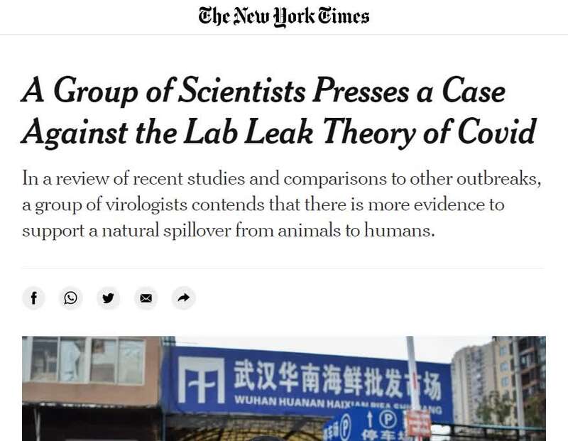 柯文思提到的這篇報(bào)道,題為“多名科學(xué)家反駁(新冠病毒)實(shí)驗(yàn)室泄漏論”(A Group of Scientists Presses a Case Against the Lab Leak Theory of Covid),由《紐約時(shí)報(bào)》專(zhuān)欄作者卡爾·齊默和科普作者詹姆斯·戈曼共同撰寫(xiě)。該報(bào)道在紐約時(shí)報(bào)網(wǎng)站上首發(fā)于7月9日,7月22日有內(nèi)容更新。報(bào)道援引21名權(quán)威病毒學(xué)家最新發(fā)表的一份聯(lián)名報(bào)告說(shuō),最可能導(dǎo)致新冠病毒大流行的原因,是從動(dòng)物到人類(lèi)的“自然溢出”,而不是所謂“實(shí)驗(yàn)室泄漏”。由于“新冠病毒源于自然”的證據(jù)越來(lái)越多,就連以前對(duì)此持懷疑態(tài)度的科學(xué)家也開(kāi)始“倒戈”,明確反對(duì)某些西方政客制造的“陰謀論”。