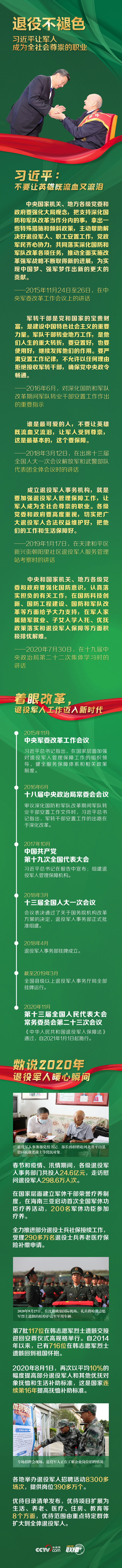 數(shù)百萬退役軍人得到妥善安置,撫恤補(bǔ)助標(biāo)準(zhǔn)連年提高,部分退役士兵社會保險得以接續(xù),退役軍人就業(yè)創(chuàng)業(yè)環(huán)境不斷優(yōu)化……廣大退役軍人感受到了實實在在的溫暖,全社會掀起了關(guān)愛退役軍人之風(fēng)。央視網(wǎng)《聯(lián)播+》特推出長圖解,與您一起學(xué)習(xí)了解。