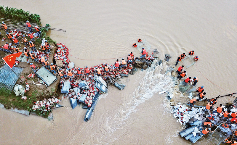 2021年7月,河南多地遭遇持續(xù)強降雨后,駐豫部隊爭分奪秒投入防汛搶險和災后重建,盡最大努力保障人民生命財產安全,盡快恢復百姓生產生活秩序。圖為空降兵某旅官兵用石塊、沙袋構筑子堤。 余紅春/攝