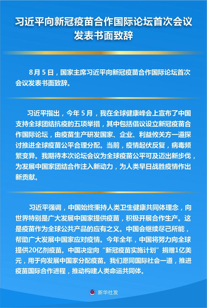 “今年5月,我在全球健康峰會上宣布了中國支持全球團(tuán)結(jié)抗疫的五項舉措,其中包括倡議設(shè)立新冠疫苗合作國際論壇,由疫苗生產(chǎn)研發(fā)國家、企業(yè)、利益攸關(guān)方一道探討推進(jìn)全球疫苗公平合理分配!绷(xí)近平在書面致辭中介紹了本次論壇的由來。