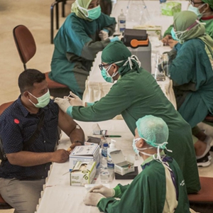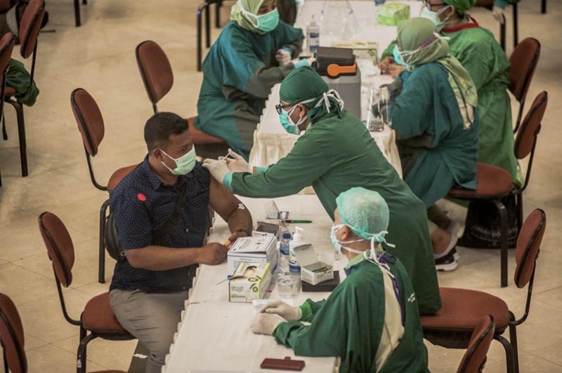1月28日,一名醫(yī)務(wù)工作者在印度尼西亞日惹接種中國科興公司的新冠疫苗。新華社發(fā)(蘇普里揚(yáng)托攝)