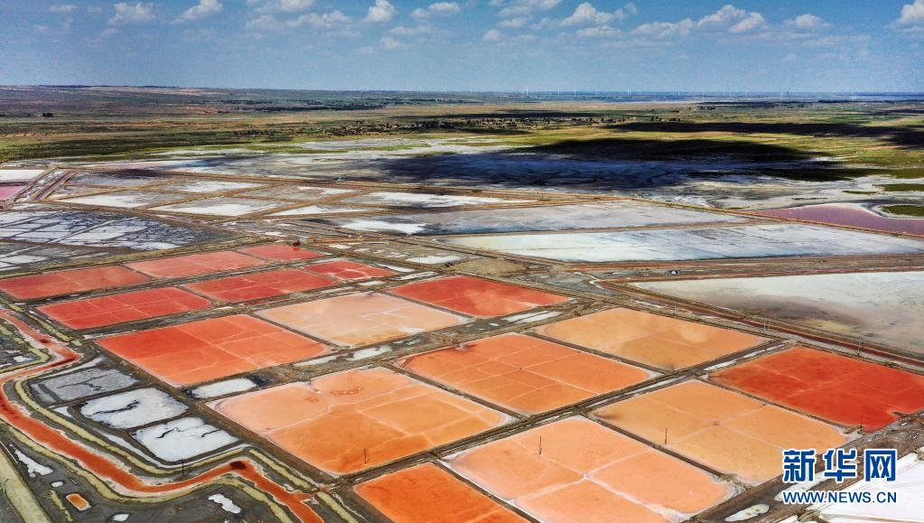 陜西省榆林市定邊縣是陜西省的湖鹽產(chǎn)區(qū),鹽湖群主要分布在一條西南至東北走向的弧線低洼地帶。每年的夏秋時節(jié),湖中不同的礦物成分和藻類,讓鹽田在高溫和光線的共同作用下呈現(xiàn)出五彩斑斕的顏色,仿佛鋪陳在大地上的調(diào)色板。