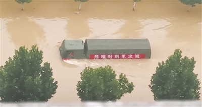 從高空向下俯瞰,在積水中前行的軍車,就像一艘滿載希望的方舟,在這座被暴雨圍困的城市里,把信心與勇氣、生機(jī)與力量傳遞給每一名受困的群眾。