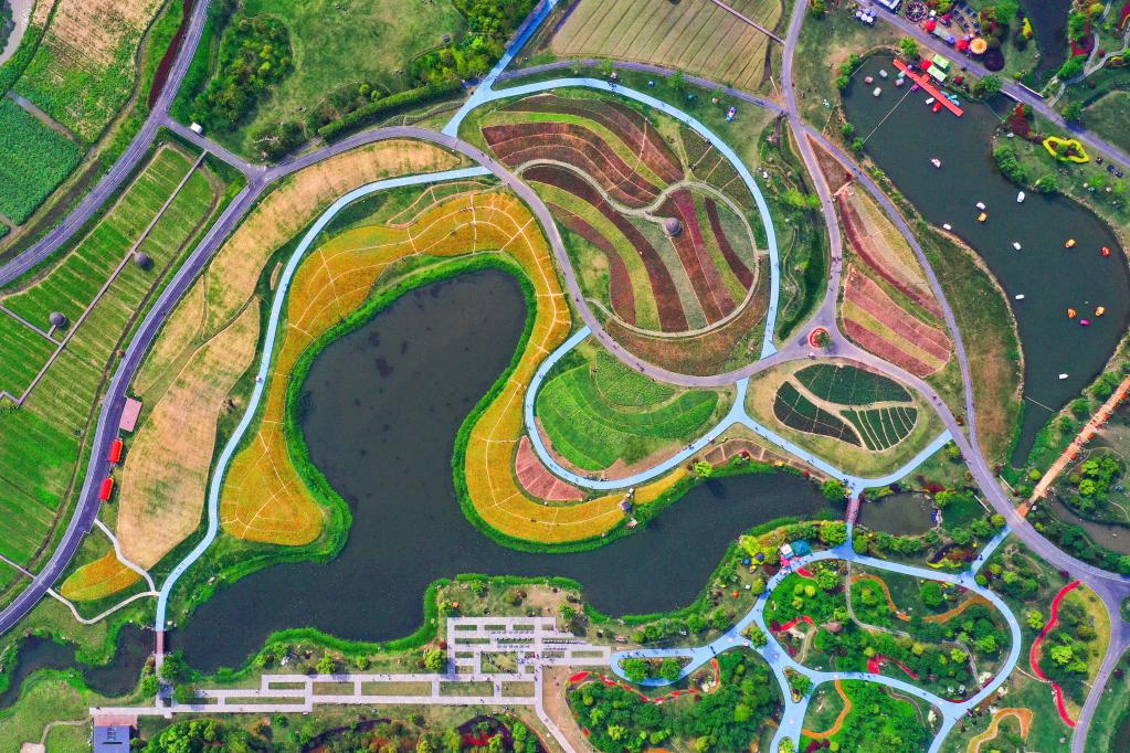 2021年5月2日,空中俯瞰浙江省杭州市余杭區(qū)徑山鎮(zhèn)的千畝繽紛花海(無人機照片)。新華社記者 徐昱 攝