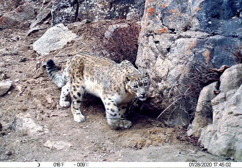 ▲ 布設(shè)在甘肅祁連山國家級自然保護(hù)區(qū)內(nèi)的紅外相機(jī)于2020年1月28日拍攝的雪豹活動影像 大熊貓祁連山國家公園甘肅省管理局張掖分局供圖