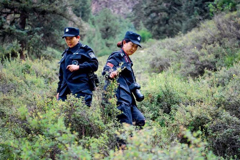 ▲ 8月11日,在甘肅祁連山國家級自然保護(hù)區(qū)內(nèi),生態(tài)管護(hù)員白擁梅(右)和同事巡護(hù)林區(qū) 范培珅攝/本刊