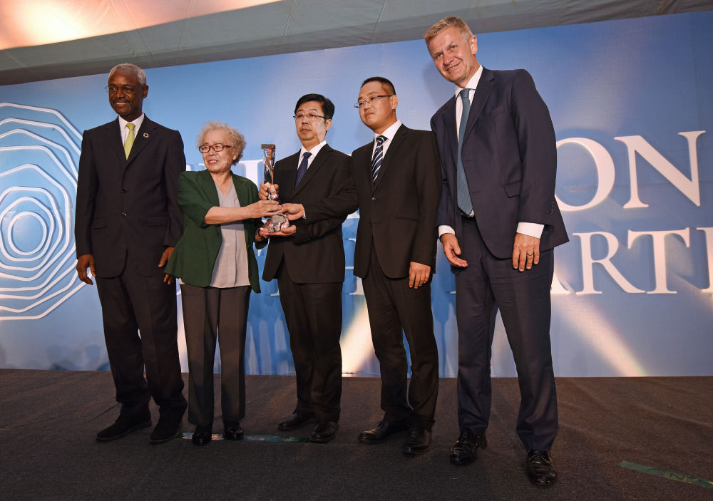 ↑在肯尼亞內(nèi)羅畢聯(lián)合國環(huán)境規(guī)劃署總部,老、中、青三位塞罕壩人陳彥嫻(左二)、劉,摚ㄖ校、于士濤(右二)領(lǐng)取2017年聯(lián)合國環(huán)保最高榮譽(yù)——“地球衛(wèi)士獎”(2017年12月5日攝)。