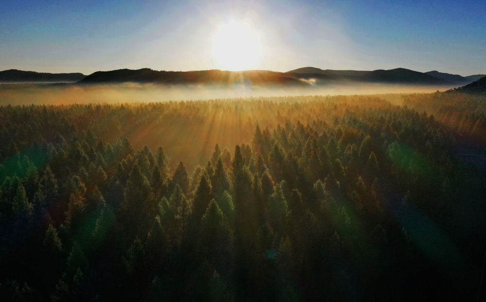 ↑塞罕壩國家森林公園晨景(2021年6月27日攝,無人機(jī)照片)。