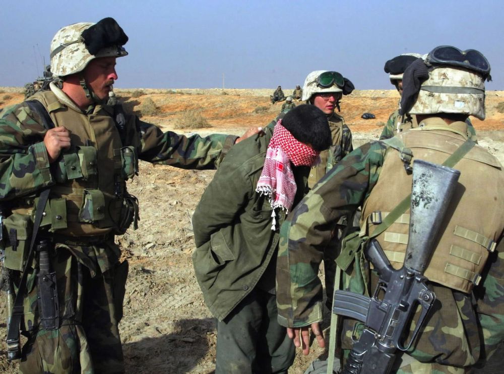 2003年4月1日,美國海軍陸戰(zhàn)隊士兵在伊拉克南部的迪瓦尼耶附近押解一名被蒙上雙眼的伊拉克戰(zhàn)俘。(新華社發(fā),法切利攝)