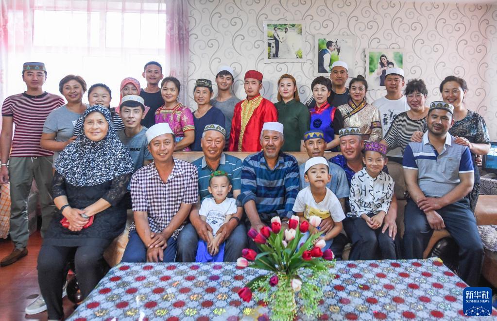 這是家住內(nèi)蒙古呼倫貝爾的夏民山(前排右三)家的家庭合影。他家由回族、漢族、蒙古族、達(dá)斡爾族、鄂溫克族、滿族共6個(gè)民族組成,45口人,三代同堂(2017年7月16日攝)。新華社記者 連振 攝