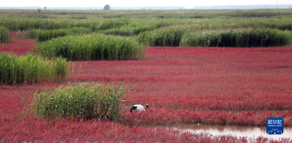 這是8月19日在紅海灘國家濕地公園里拍攝的丹頂鶴。新華社記者 姚劍鋒 攝
