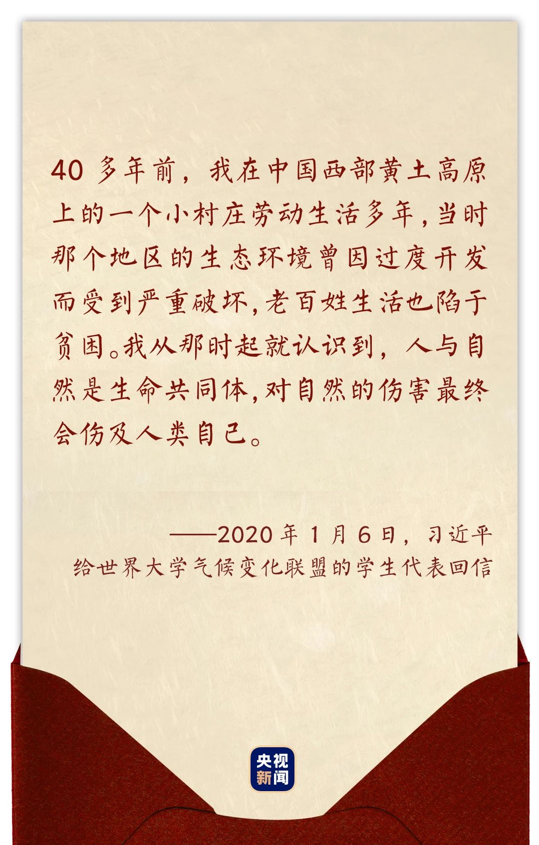 2020年1月6日,習(xí)近平在給世界大學(xué)氣候變化聯(lián)盟的學(xué)生代表回信時,這樣回憶道——
