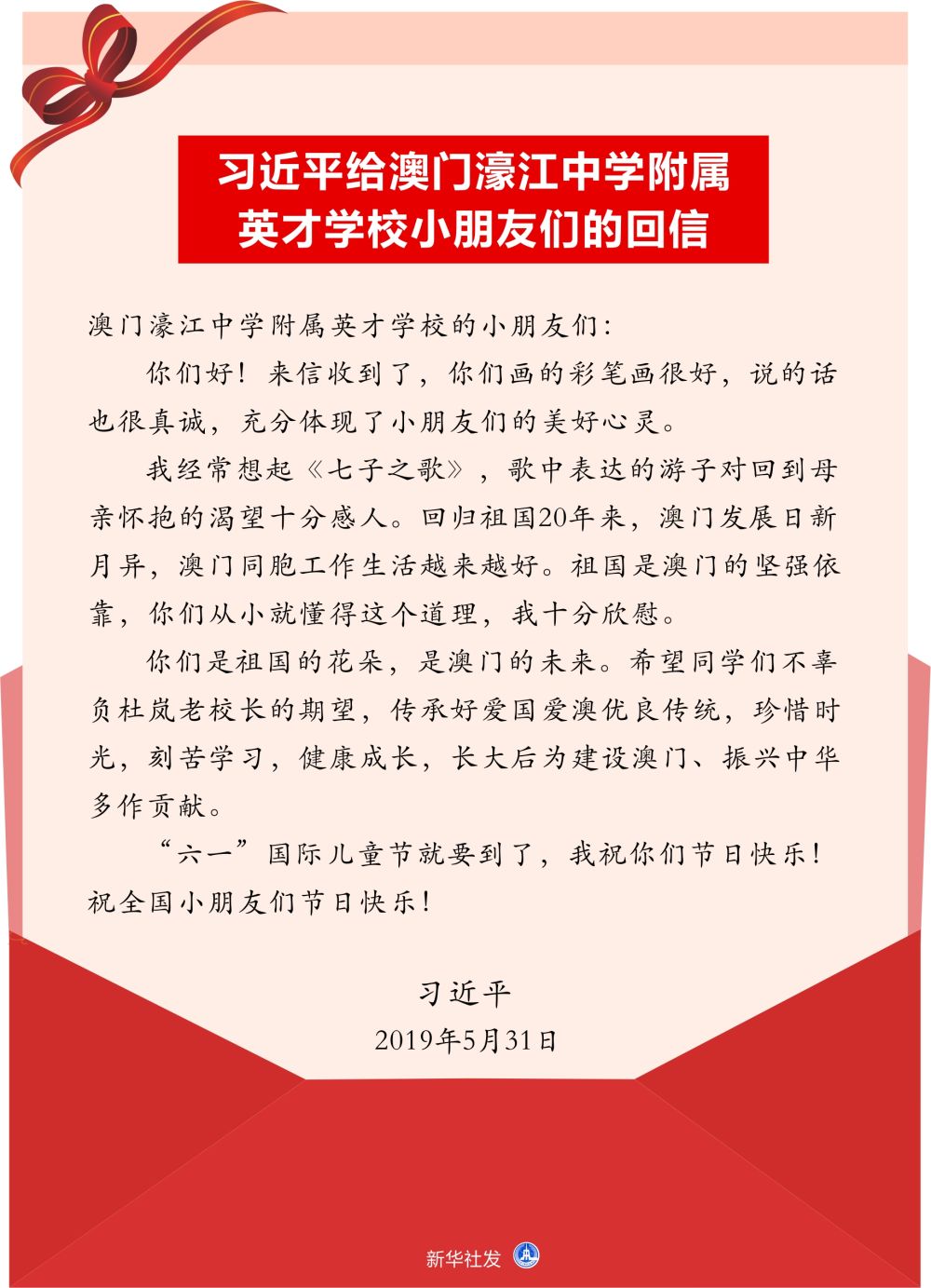 ↑習(xí)近平給澳門(mén)濠江中學(xué)附屬英才學(xué)校小朋友們的回信。新華社發(fā)