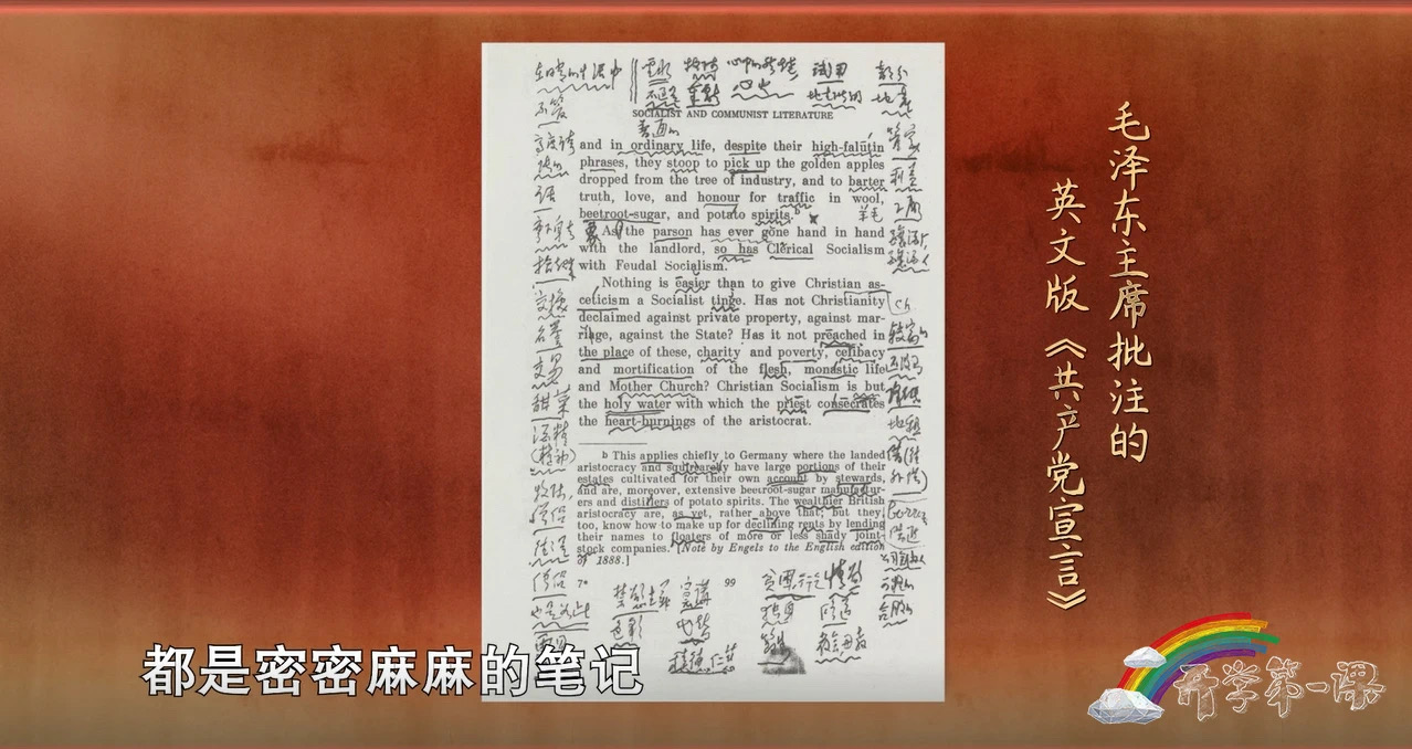 六十多歲的毛澤東主席想學(xué)一些馬克思主義經(jīng)典著作的英文本,他第一本選的也是《共產(chǎn)黨宣言》。閱讀的時(shí)候,毛澤東主席一邊思考一邊做著筆記,從第一頁到最后一頁,都是他密密麻麻的批注。