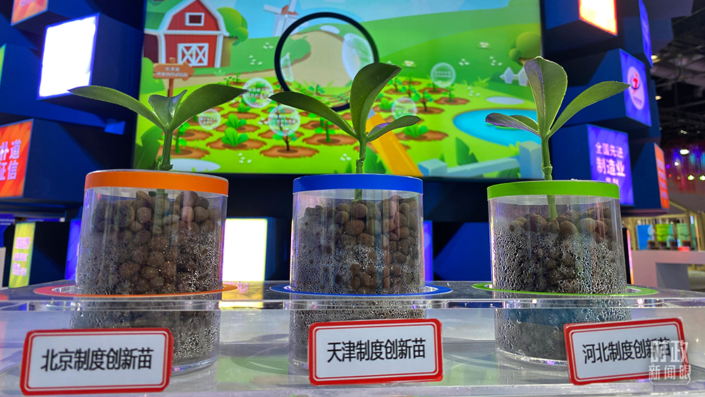 △京津冀三地“協(xié)同苗”亮相服貿(mào)會。這是一個互動裝置,觀眾可任意取下一棵放在操作臺感應(yīng)區(qū),了解京津冀三地開放創(chuàng)新舉措的內(nèi)容、案例、配圖等。(總臺央視記者于海燕拍攝)
