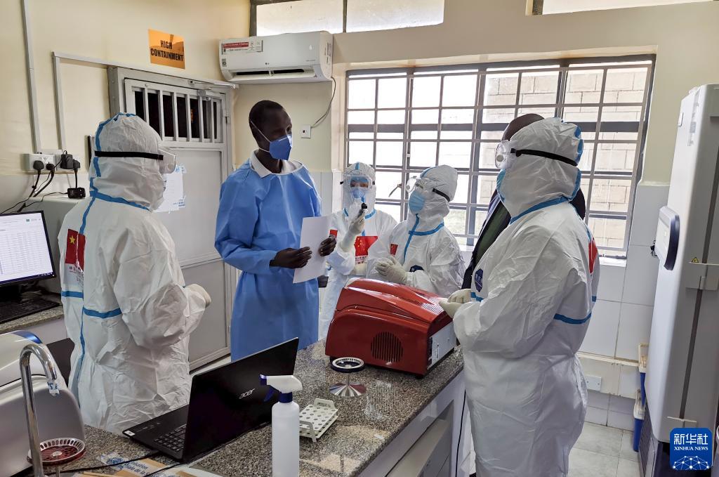 在南蘇丹首都朱巴的一處新冠病毒檢測(cè)機(jī)構(gòu),中國(guó)抗疫醫(yī)療專家組成員與南一線醫(yī)護(hù)人員交流(2020年8月21日攝)。新華社發(fā)(中國(guó)駐南蘇丹大使館供圖)