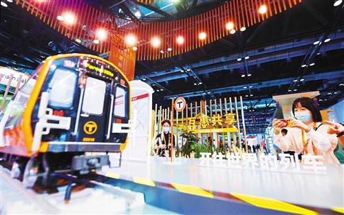 觀眾在2021年中國(guó)國(guó)際服務(wù)貿(mào)易交易會(huì)智慧交通服務(wù)展位“開往世界的列車”前拍照。服貿(mào)會(huì)是全球服務(wù)貿(mào)易領(lǐng)域規(guī)模最大、內(nèi)容最豐富的國(guó)際展會(huì),也是我國(guó)促進(jìn)高水平對(duì)外開放的重要平臺(tái)。