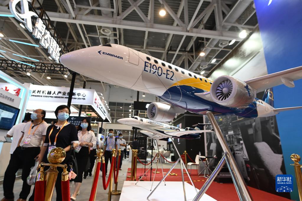 這是2021金磚國家新工業(yè)革命展巴西航空工業(yè)公司展位展出的飛機模型(9月8日攝)。新華社記者 林善傳 攝