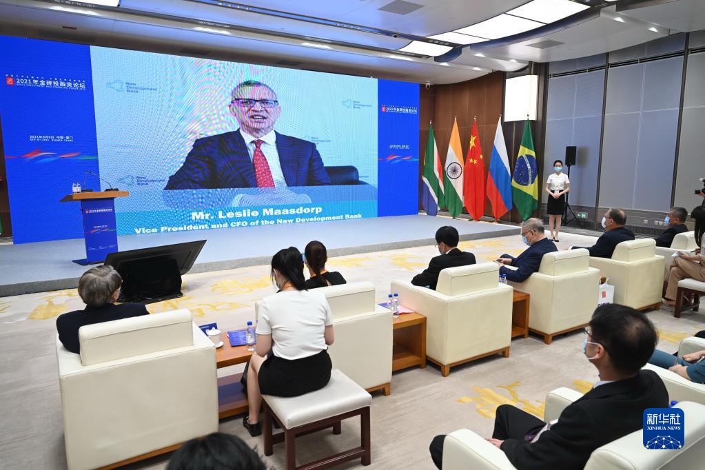 9月9日,金磚國家新開發(fā)銀行副行長兼首席財務官馬磊立在2021年金磚投融資論壇上通過視頻發(fā)言。新華社記者 林善傳 攝