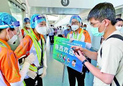 9月14日,在西安咸陽(yáng)機(jī)場(chǎng),工作人員為參加全運(yùn)會(huì)的記者提供服務(wù)。光明日?qǐng)?bào)記者 郭紅松攝/光明圖片