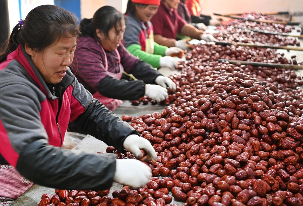 陜西省榆林市佳縣佳州街道木場灣村村民在分揀紅棗(2021年1月19日攝)。新華社記者 陶明 攝