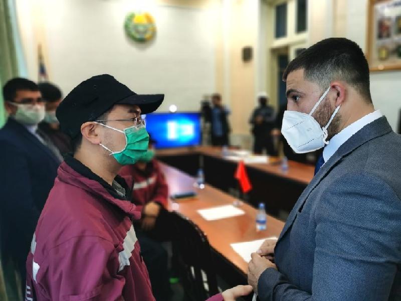 2020年4月20日,在烏茲別克斯坦費(fèi)爾干納州,肯熱巴耶夫(右)與中國(guó)政府聯(lián)合醫(yī)療工作組成員交流。