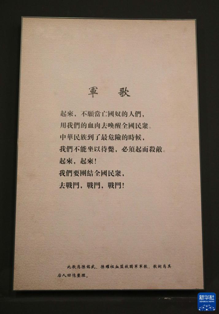 在東北抗日義勇軍紀(jì)念館拍攝的孫銘武、孫耀祖創(chuàng)作的《血盟救國軍軍歌》歌詞(7月21日攝)。新華社記者 蔡湘鑫 攝