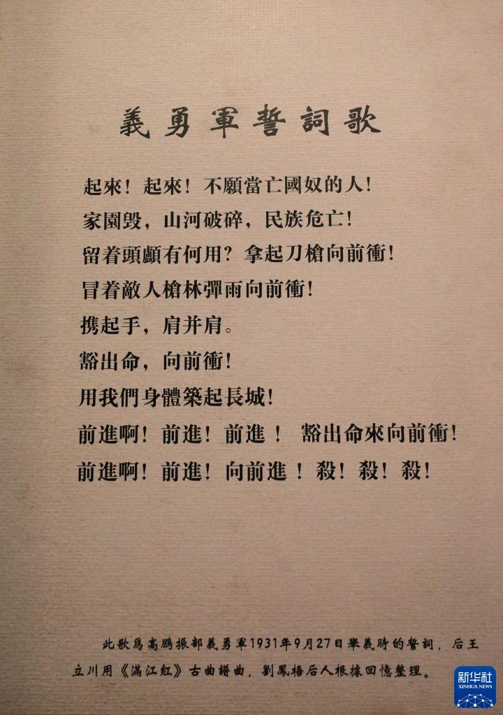 在東北抗日義勇軍紀(jì)念館拍攝的《義勇軍誓詞歌》歌詞(7月21日攝)。新華社記者 蔡湘鑫 攝