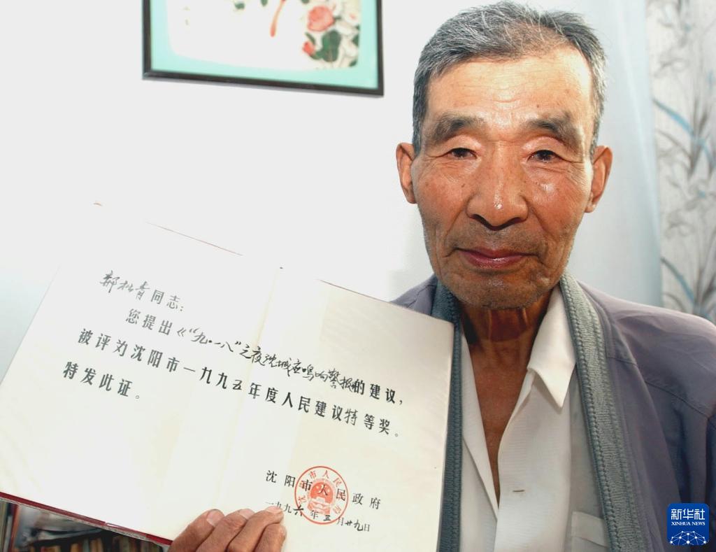 沈陽市民郝松青在展示自己“9月18日鳴響警報(bào)的建議”獲得當(dāng)年人民建議特等獎(jiǎng)證書(2005年9月13日攝)。新華社發(fā)
