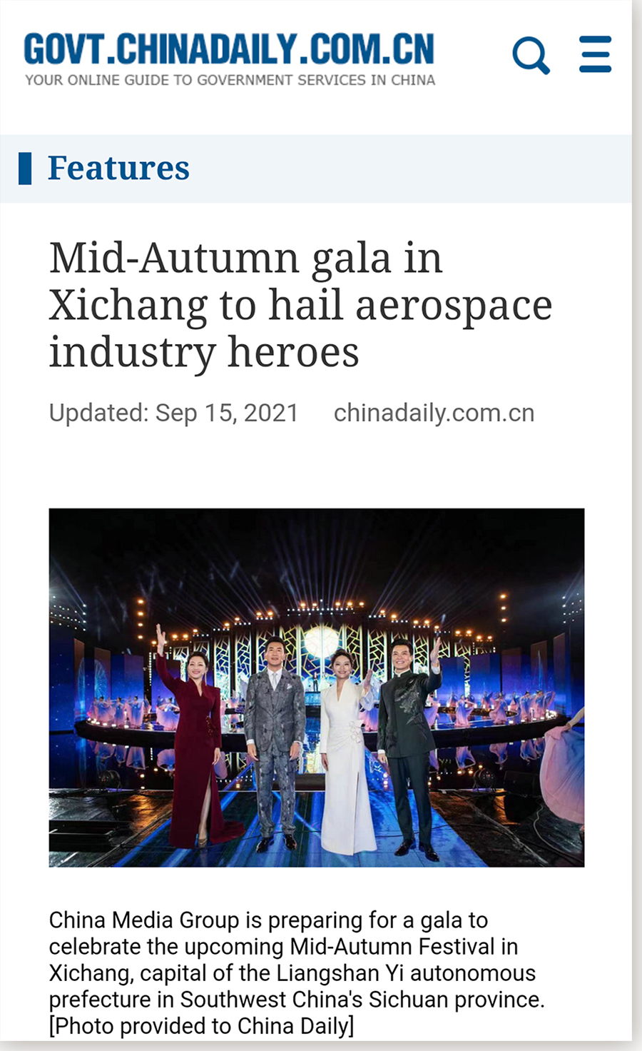 《中國日報》刊發(fā)英文報道《Mid-Autumn gala in Xichang to hail aerospace industry heroes》,對晚會選址、舞美、節(jié)目等方面體現(xiàn)出的“秋晚品質”加以肯定。報道評價道:“從目前公開的內容來看,無論是與晚會契合度極高的巧妙選址,還是科技與藝術效果交融,古今結合的舞美效果,以及精心雕琢傳遞多重關懷的節(jié)目編排,都體現(xiàn)了今年秋晚的品質與匠心”!稌r代論壇報》刊發(fā)題為《2021中秋晚會:匠心雕琢 娓娓道來中秋的故事》的文章,也著重報道了晚會的匠心之筆。