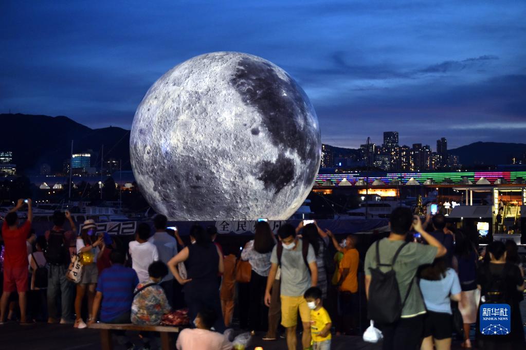 當(dāng)日, 香港觀塘海濱長(zhǎng)廊旁裝置了高達(dá)15米的巨型發(fā)光“月亮”,吸引不少市民前來(lái)觀看。新華社記者 盧炳輝 攝