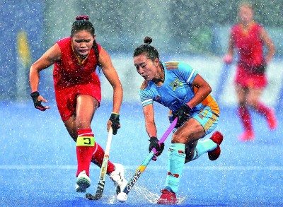 9月24日,全運會女子曲棍球決賽中,四川隊球員但文(右)與聯(lián)合隊球員崔秋霞在比賽中拼搶。新華社發(fā)