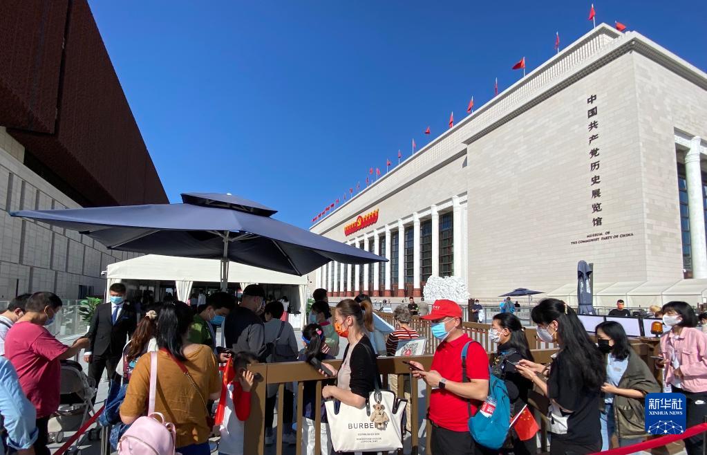 10月1日,人們?cè)谥袊?guó)共產(chǎn)黨歷史展覽館入口處排隊(duì)入館。