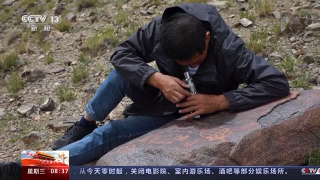 總臺(tái)記者 陳琴:現(xiàn)在我們是跟隨科考隊(duì)員來(lái)到了海拔4700米的加林山巖畫(huà)這么一個(gè)分布區(qū)域,這里的位置就是在尼瑪縣榮瑪鄉(xiāng)依布茶卡鹽湖的旁邊,我們看見(jiàn)科考隊(duì)員正在對(duì)這幅巖畫(huà)進(jìn)行登記和記錄。