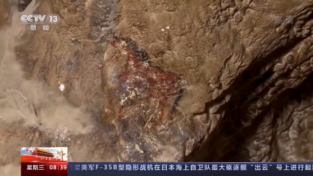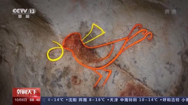 總臺(tái)記者 陳琴:現(xiàn)在我們就來(lái)到納木錯(cuò)環(huán)湖科考巖畫(huà)調(diào)查點(diǎn)的1號(hào)點(diǎn),您看到這個(gè)巖畫(huà)是由紅色的赭石這個(gè)顏料做成的,看起來(lái)特別像一只可愛(ài)的小鳥(niǎo)。