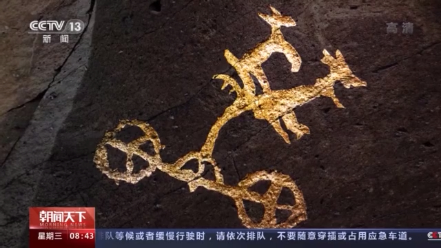 中國(guó)巖畫(huà)學(xué)會(huì)副會(huì)長(zhǎng)、西北大學(xué)文化遺產(chǎn)學(xué)院特聘教授 張建林:這個(gè)確定成車(chē)是沒(méi)有問(wèn)題的,因?yàn)樗@個(gè)是兩個(gè)車(chē)輪嘛,這個(gè)是軸,這個(gè)是它的車(chē)輿,它跟后來(lái)秦漢以后那種雙轅的這種車(chē)是完全不一樣的,這是早期的車(chē)。