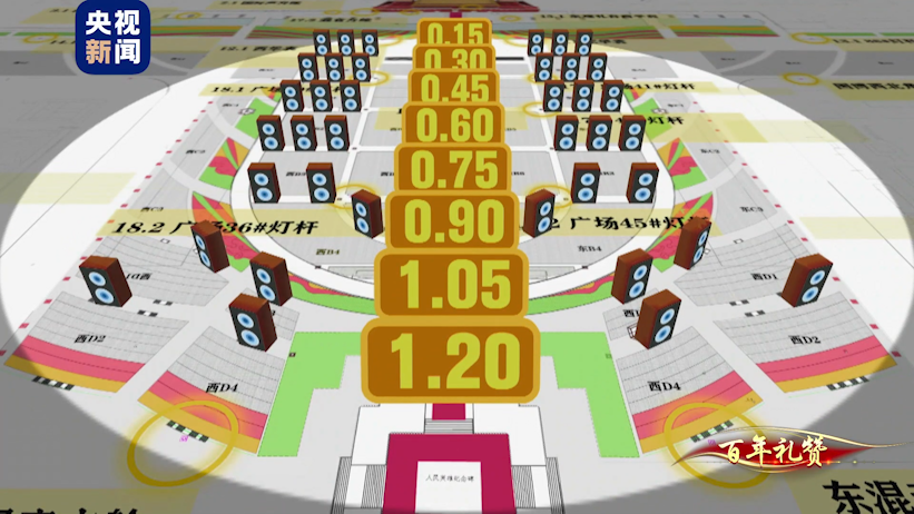 以廣場最北側(cè)的第一排音箱作為基線,音響團(tuán)隊(duì)按照從北往南的順序,將每個(gè)觀眾方陣前的音箱發(fā)聲設(shè)置為要比前一排音箱延時(shí)0.15秒后再發(fā)聲。這就意味著最后一排音箱的發(fā)聲比第一排音箱延時(shí)發(fā)聲約1.2秒。這就保證了七一當(dāng)天無論坐在哪個(gè)方陣的觀眾,當(dāng)其他任意位置的音箱聲音傳到他所在方陣的時(shí)候,他面前的這排音箱也正好開始出聲。保證了各個(gè)音箱之間不發(fā)生聲音相互干擾,同時(shí)也讓現(xiàn)場的每一位觀眾都能聽到清晰飽滿的聲音。(總臺(tái)央視記者 侯軍 李文杰 劉潔 周培培 王瑞寧 曾文甫)