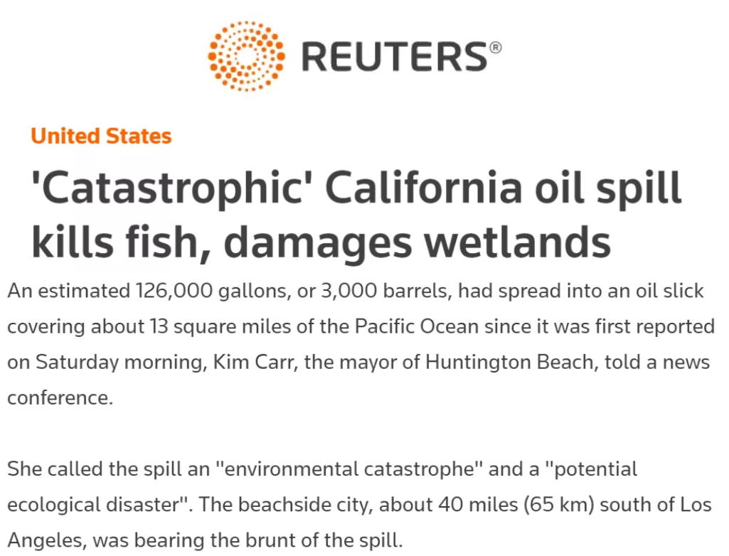2015年,圣巴巴拉海岸以北一條輸油管道破裂,承擔(dān)事故責(zé)任的公司最初估計(jì)泄漏量為2.1萬(wàn)加侖,但后來(lái)將其修改為超過(guò)14萬(wàn)加侖,并且該公司事后承認(rèn)在發(fā)現(xiàn)泄漏三個(gè)多小時(shí)后才通知聯(lián)邦監(jiān)管機(jī)構(gòu)……