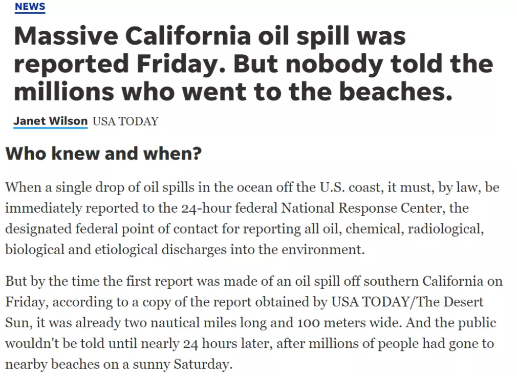 據(jù)《今日美國(guó)報(bào)》報(bào)道,加州州長(zhǎng)緊急服務(wù)辦公室在當(dāng)?shù)貢r(shí)間1日傍晚6點(diǎn)左右就收到原油泄漏的相關(guān)消息,然而,有關(guān)部門卻隱瞞了這一消息近24個(gè)小時(shí)后才向民眾公開(kāi)。而發(fā)生泄漏事故的涉事石油公司第二天才通報(bào)管道泄漏的消息。這導(dǎo)致成千上萬(wàn)名當(dāng)?shù)鼐用窈陀慰?日前往被污染的海灘時(shí),生命健康遭受嚴(yán)重威脅。