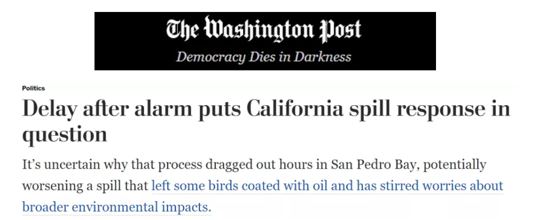 美國(guó)加利福尼亞州南部奧蘭治縣海岸日前發(fā)生嚴(yán)重原油泄漏事故,截至當(dāng)?shù)貢r(shí)間5日晚,總計(jì)已有14.4萬(wàn)加侖(約合54.5萬(wàn)升)原油發(fā)生泄漏,給當(dāng)?shù)厣鷳B(tài)環(huán)境造成嚴(yán)重威脅。在此次事故中,美國(guó)各相關(guān)部門應(yīng)對(duì)遲緩、處理消極引發(fā)了當(dāng)?shù)鼐用窈屯饨绲臉O大不滿,也再次暴露出美國(guó)現(xiàn)有體制的系統(tǒng)性弊端。