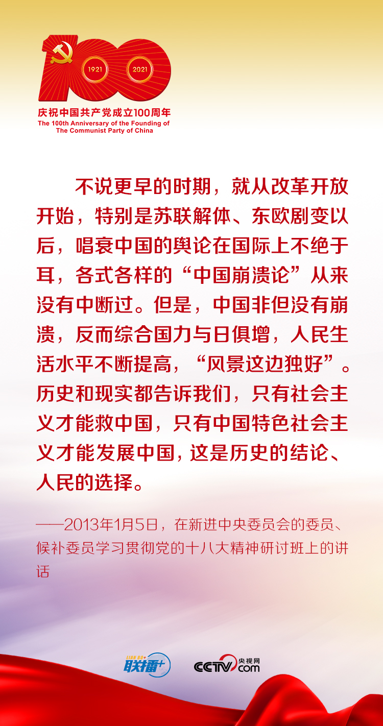 中國(guó)特色社會(huì)主義既堅(jiān)持了科學(xué)社會(huì)主義的基本原則,又根據(jù)時(shí)代條件不斷展現(xiàn)其鮮明的中國(guó)特色。黨的十八大以來(lái),習(xí)近平總書(shū)記在不同場(chǎng)合生動(dòng)回答了中國(guó)特色社會(huì)主義為什么好這個(gè)重大問(wèn)題。央視網(wǎng)《聯(lián)播+》特梳理總書(shū)記講話要點(diǎn),與您一起學(xué)習(xí)領(lǐng)悟走中國(guó)特色社會(huì)主義道路的正確性,堅(jiān)定走中國(guó)特色社會(huì)主義道路的信心與決心。