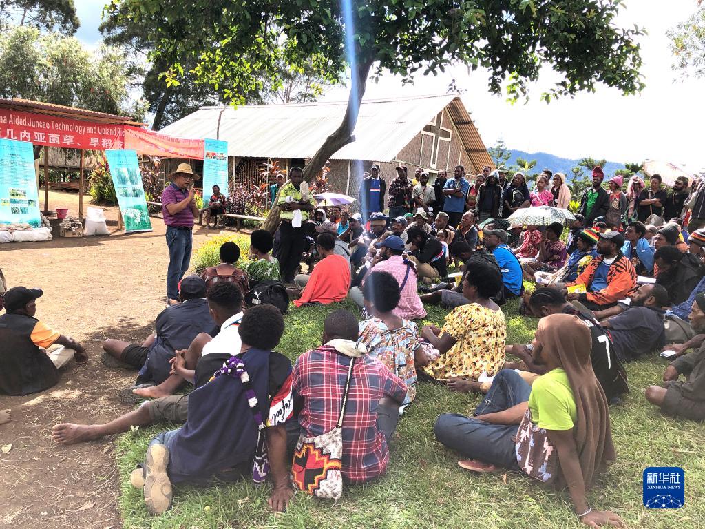 2020年12月15日,中國(guó)援巴布亞新幾內(nèi)亞菌草旱稻項(xiàng)目專(zhuān)家組組長(zhǎng)林應(yīng)興(戴草帽者)在巴布亞新幾內(nèi)亞?wèn)|高地省中國(guó)援助巴新菌草和旱稻技術(shù)項(xiàng)目第9期培訓(xùn)班上授課。新華社發(fā)