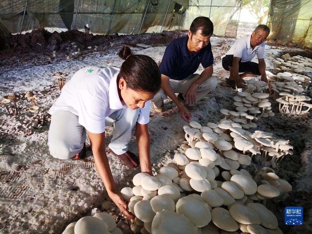 2018年6月12日,在斐濟(jì)楠迪,中國(guó)專(zhuān)家和當(dāng)?shù)毓蛦T檢查菌菇生長(zhǎng)情況。新華社記者張永興攝